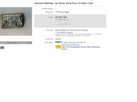...). nach meinen Recherchen hatte sich dort eine Quelle einiger alter JMC 1 Oz. S. Barren aufgetan....Interesannt daran ist - das 6 dieser Barren an einen Bieter aus den USA gingen - nur 2 dieser Barren gingen an 2 andere Bieter in den USA. Anhand der Ausschläge nach oben kann man erkennen welche...