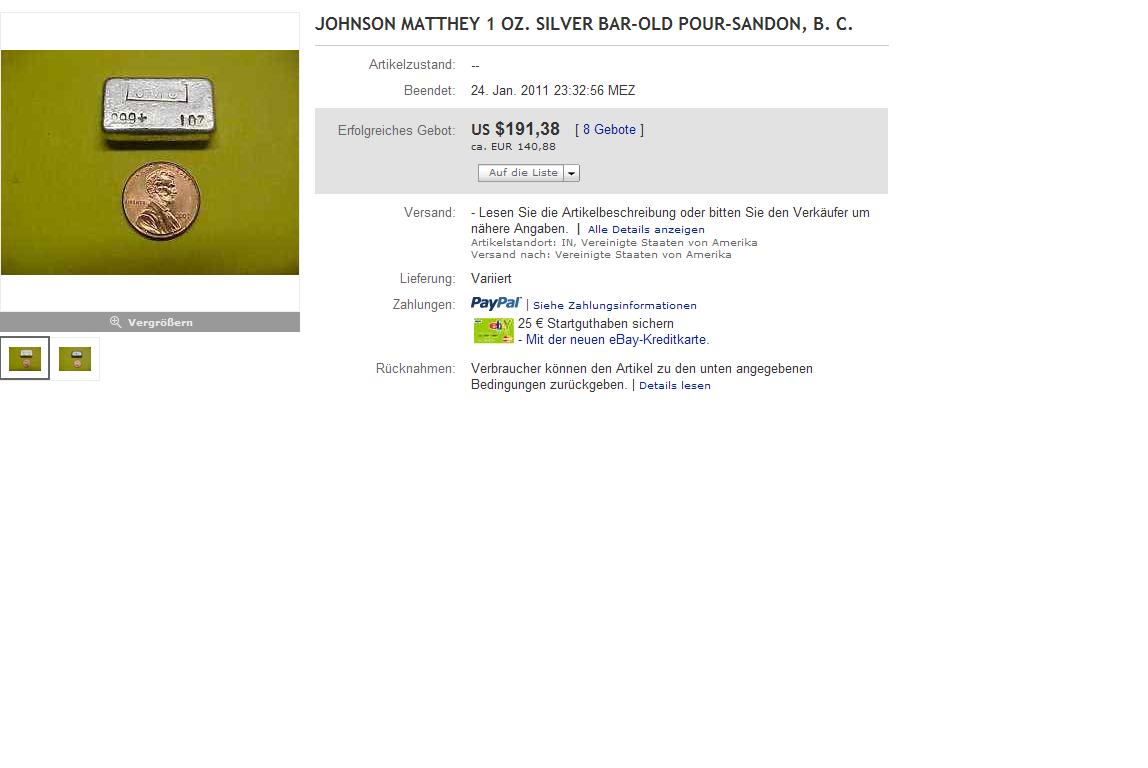 Am 24.01.11 ist nochmals ein zweiter - 1 Oz. AG Barren aus gleicher Quelle aufgetaucht....das Ergbnis beider Auktionen nochmals im direkten Vergleich s.u.
