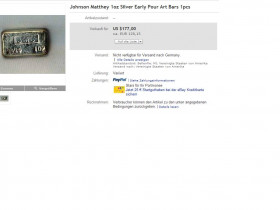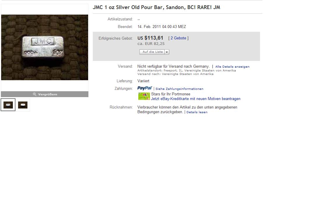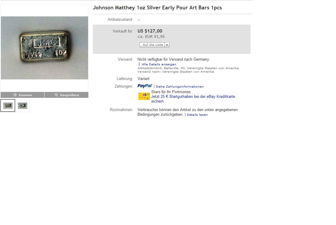...). nach meinen Recherchen hatte sich dort eine Quelle einiger alter JMC 1 Oz. S. Barren aufgetan....Interesannt daran ist - das 6 dieser Barren an einen Bieter aus den USA gingen - nur 2 dieser Barren gingen an 2 andere Bieter in den USA. Anhand der Ausschläge nach oben kann man erkennen welche...