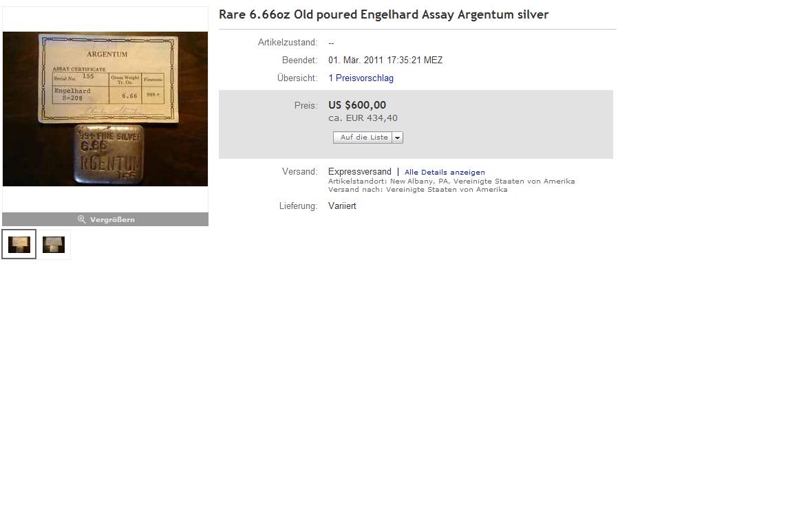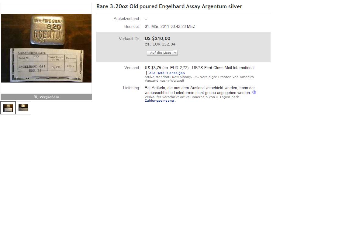 Am 24.01.11 ist nochmals ein zweiter - 1 Oz. AG Barren aus gleicher Quelle aufgetaucht....das Ergbnis beider Auktionen nochmals im direkten Vergleich s.u.