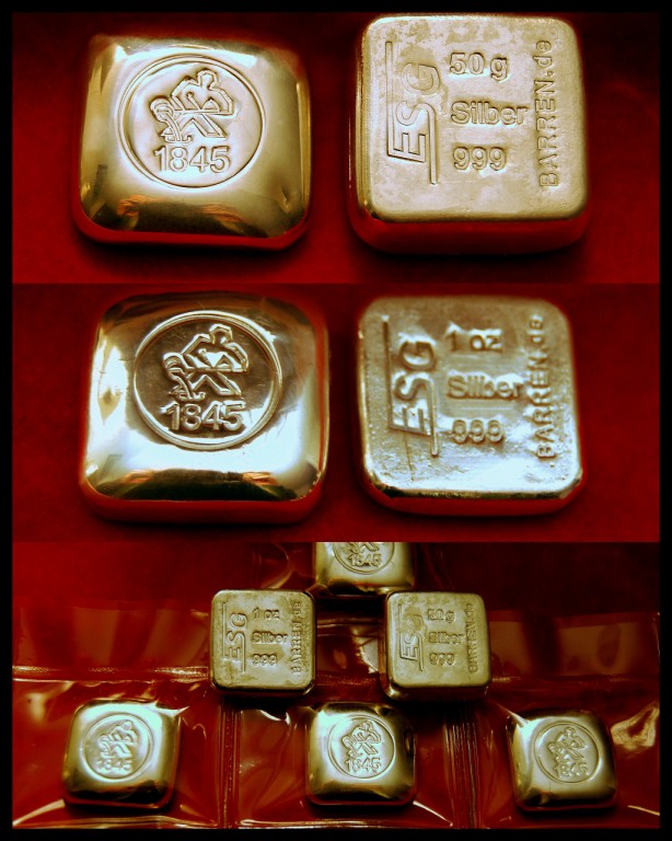 beginnend im neuen Jahr und ergänzend zu GM seinen "Neuzeit" Güsslingen möchte ich euch hier die ersten neuen Silber Gussbarren der ESG vorstellen. Die Bilder zeigen die Version in 1 Oz sowie in 50g Silber gegossen als Barren in Quaderform. Diese werden einzeln verschweisst in Folie geliefert. Allerdings was wären Gussbarren in Folie wenn man diese nicht anfassen darf - daher habe ich je ein Exemplar aus dieser befreit und ...ein wirklich geiles Gefühl - besonders der 1 Ounzer ist mein absoluter Hosentaschen Favorit.. ![]()