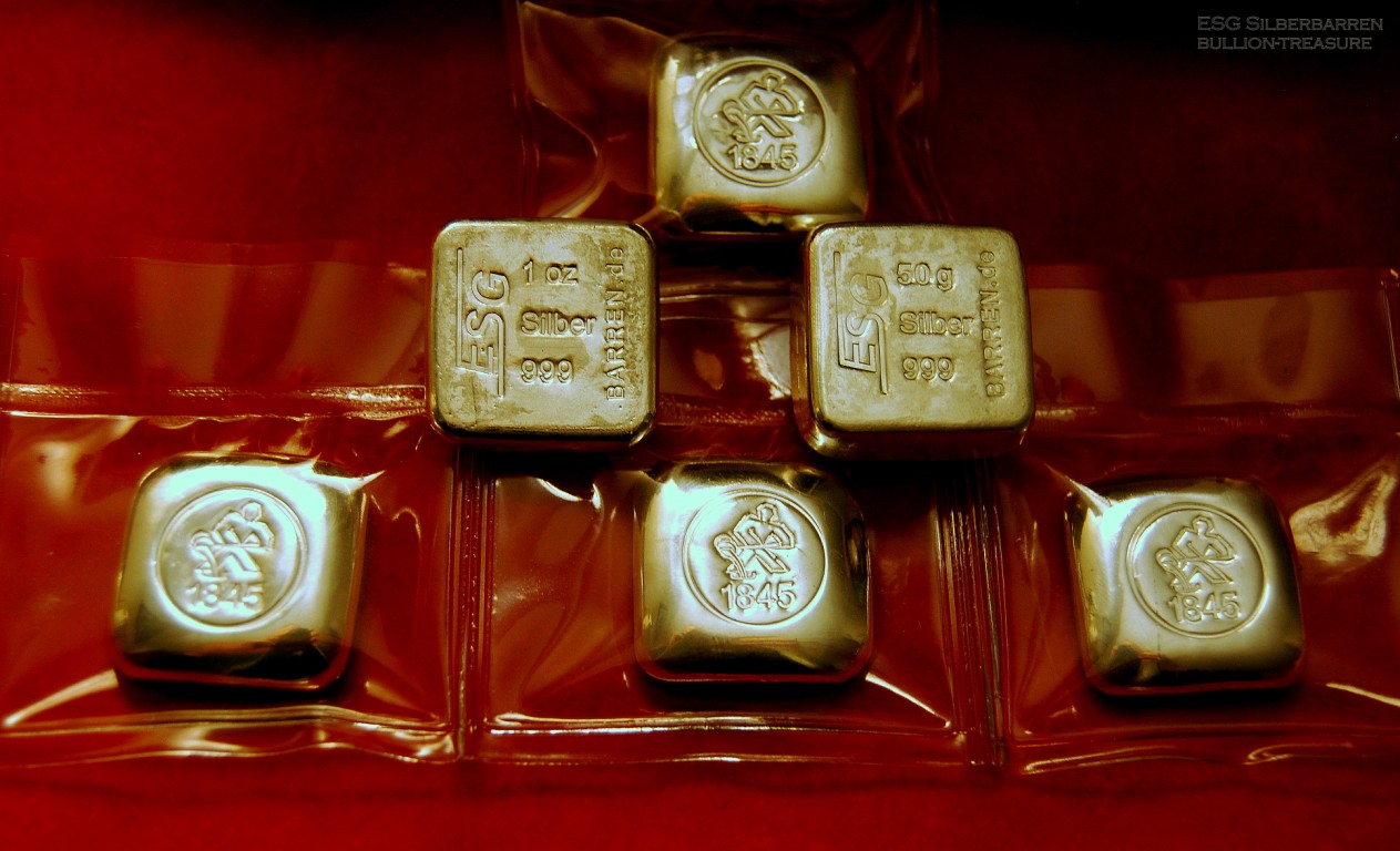 beginnend im neuen Jahr und ergänzend zu GM seinen "Neuzeit" Güsslingen möchte ich euch hier die ersten neuen Silber Gussbarren der ESG vorstellen. Die Bilder zeigen die Version in 1 Oz sowie in 50g Silber gegossen als Barren in Quaderform. Diese werden einzeln verschweisst in Folie geliefert. Allerdings was wären Gussbarren in Folie wenn man diese nicht anfassen darf - daher habe ich je ein Exemplar aus dieser befreit und ...ein wirklich geiles Gefühl - besonders der 1 Ounzer ist mein absoluter Hosentaschen Favorit.. ![]()