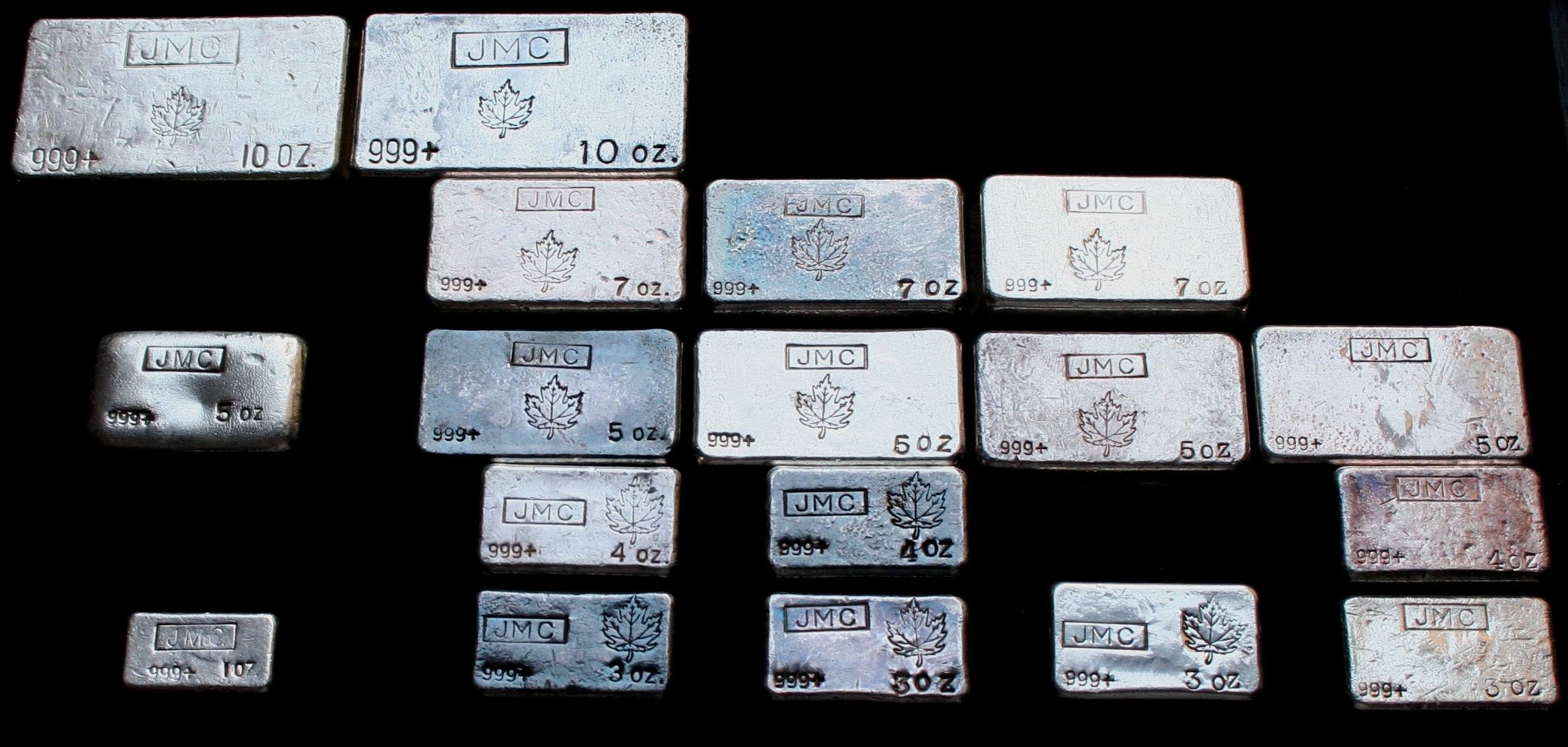 Auf den ersten Blick werden JMC-Silberbarren lediglich nach den Gewichtsklassen 1 oz - 10 oz unterschieden, jedoch fallen bei genauerer Betrachtung innerhalb dieser Stückelungen weitere feine Unterschiede bei den Stempelungen auf.