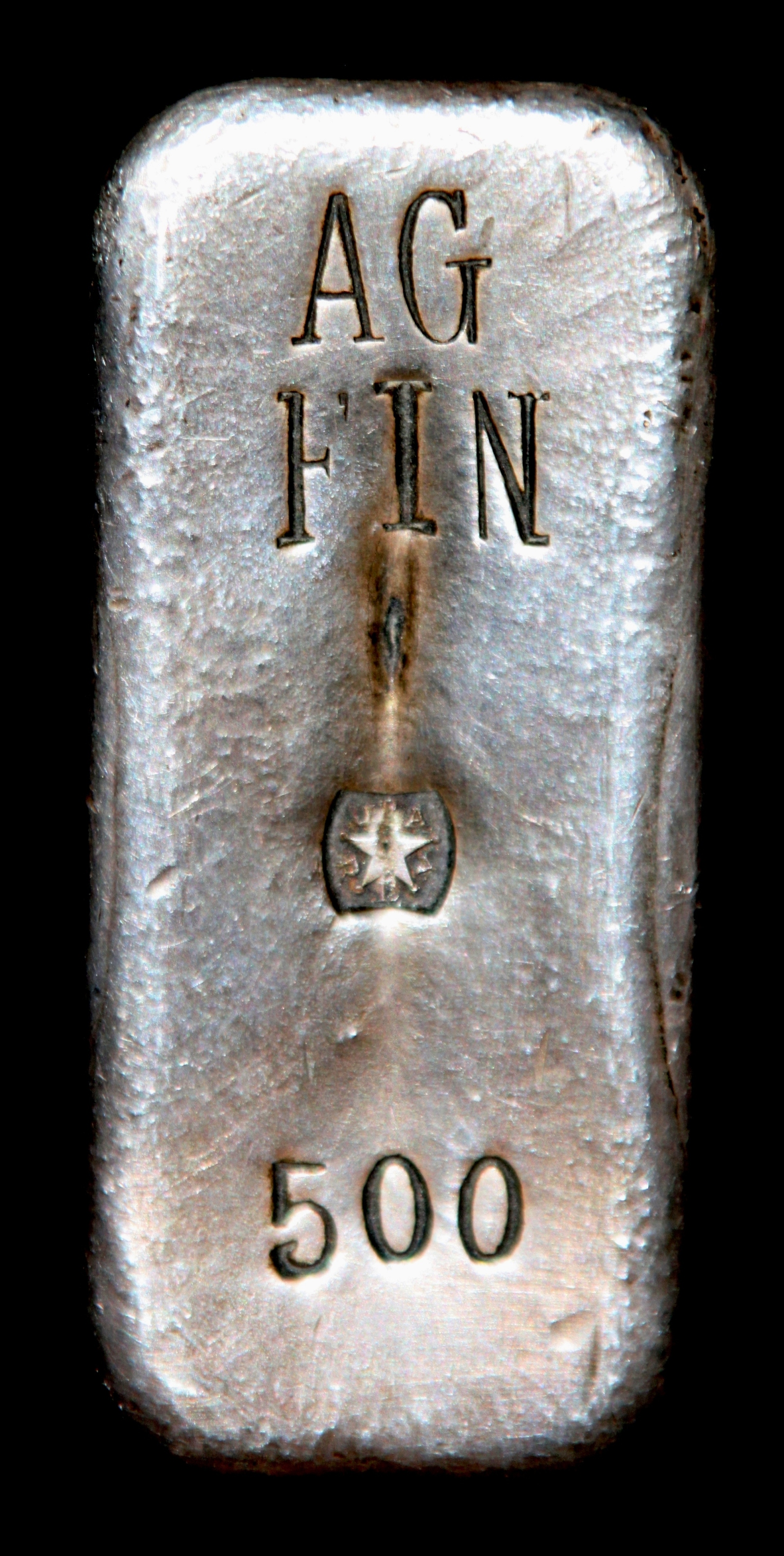 Der Hersteller dieses Barrens mit dem charakteristischen (See-)Stern und den Buchstaben J*A*R*E*Y (für Jarey oder J.A. Rey? ) ist mir immer noch nicht bekannt. Das "AG FIN" für Feinsilber deutet auf einen Ursprung in Frankreich oder im wallonischen Belgien oder in der Romandie der Schweiz. Vielleicht weiß ja doch inzwischen hier jemand mehr?