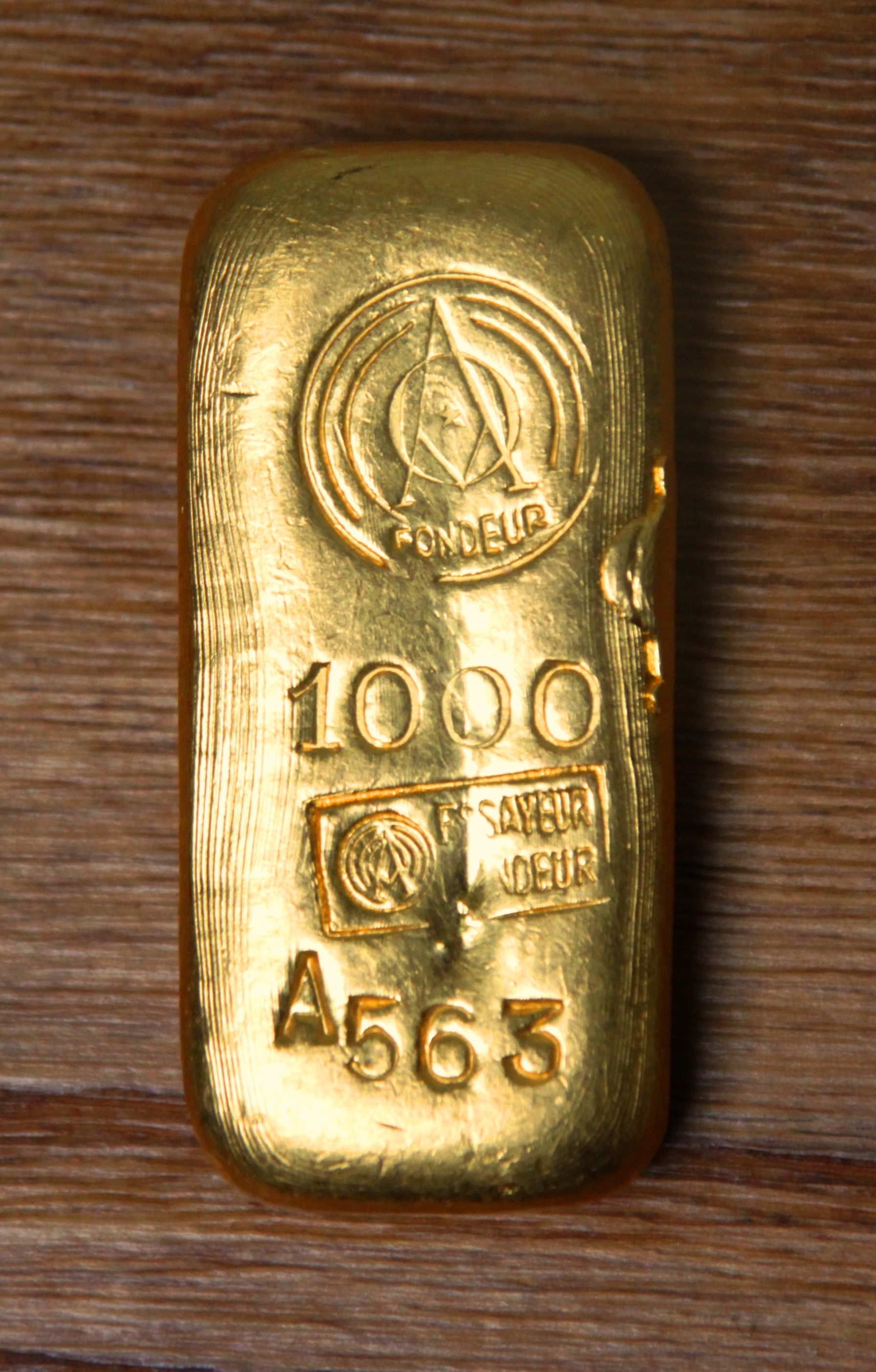 Das goldige 100-g-Exemplar mit der Seriennummer A563, das ich hier vorzeige, hat bei der Geburt schöne Erstarrungslinien mitbekommen, sich im Laufe des Lebens aber auch einige Narben eingefangen. Außergewöhnlich ist jedoch die Herstellermarke: Sie ist hier etwa, aber nicht genau eine größere Version des Prüferzeichens mit FONDEUR. Wenn man genau hinsieht, erkennt man in der Mitte des A auch noch einen kleinen 5-zackigen Stern.