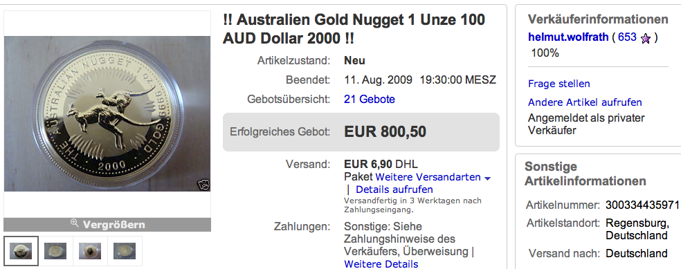 Ich hatte eine Stimme abgegeben, aber keinen Kommentar. So damit nachgeholt. Rechnerei in Euro ist mir zum Sonntag zu mühsellig, daher in Dollar 31.12.09 = 1200 -1250 $. Wenns nicht eintrifft ist es auch nicht weiter wild.