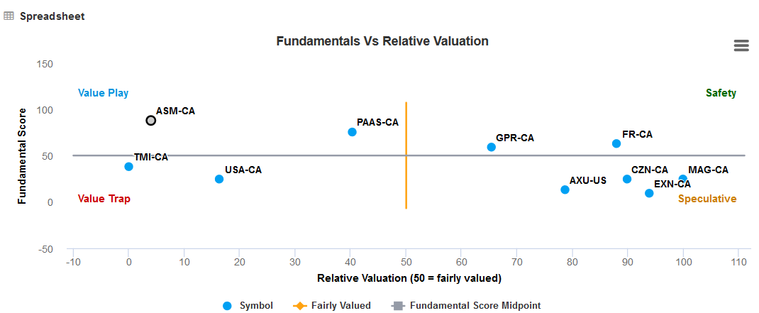 Avino Silver & Gold Mines Ltd. has a fundamental score of 88 and has a relative valuation of UNDERVALUED. Avino Silver & Gold Mines Ltd. is on the top left quadrant of the CapitalCube Value - Price Matrix. We classify this space a 'Value Play'. Here, Avino Silver & Gold Mines Ltd. is potentially undervalued, since it trades below its CapitalCube Implied Price of 3.01. At the same time, Avino Silver & Gold Mines Ltd. is also fundamentally strong with a score of 88. This is a classic value stock definition.