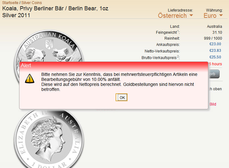 Vorteil dort: Ich weiß vorher exakt, welche Münzen in welcher Qualität ich einkaufe (ist bei standardisierten modernen Bullion Münzen natürlich kaum wichtig).