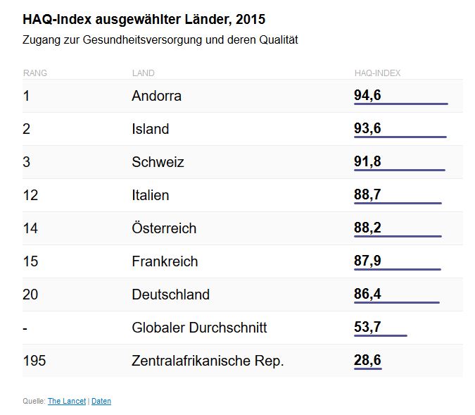 Die Wissenschaftler erstellten einen Gesundheitswesen-Index (Healthcare Access and Quality Index; HAQ-Index). Auf einer Skala von 0 bis 100 erreichte die Schweiz mit 91,8 den dritthöchsten Wert. Nur Andorra und Island wurden noch besser bewertet. Wie man sieht, liegen selbst Italien und Frankreich noch vor Deutschland .... aber träume ruhig weiter von "wir sind reich, gut, und haben ein tolles System"