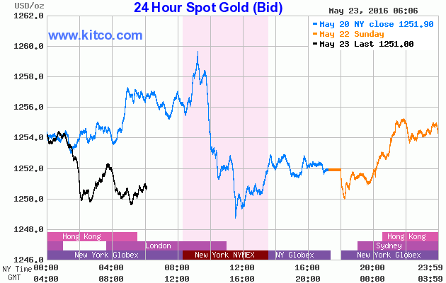 Der Goldschlusspreis betrug am 20.05.2016 bei KITCO 1251,90 $/Unze dies entspricht 1115,78 €/Unze.