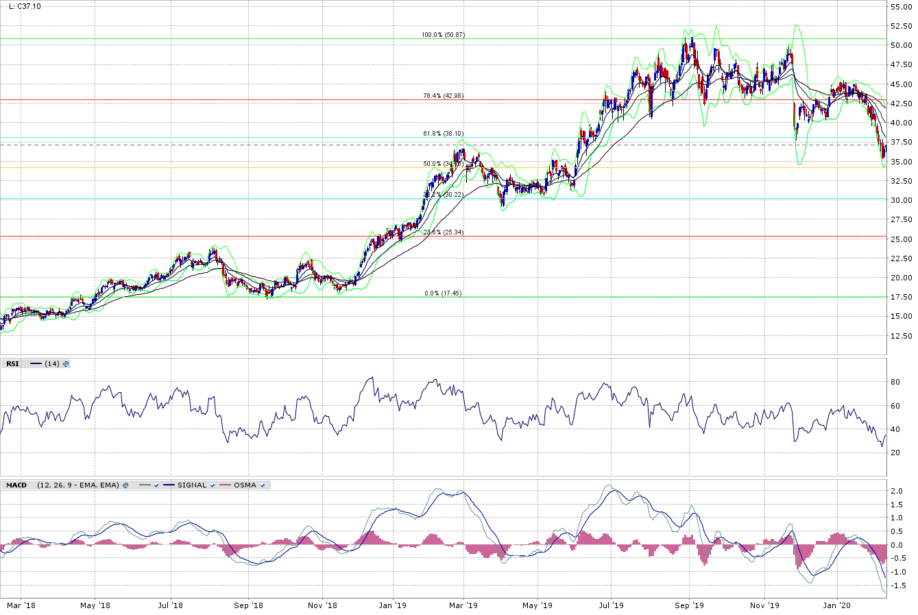Fosterville wird gemäss Plan in den nächsten 2 Jahren WENIGER produzieren als 2019, Macassa wird stagnieren. Somit ist die Phantasie kurz-mittelfristig etwas eingetrübt. Der Cashflow wird gut sein, aber eben halt auch kaum wachsen. Die Detourübernahme gibt in Sachen Wachstum und Reserven/Ressourcen langfristig wieder mehr Phantasie, kurzfristig aber auch nicht. Da muss sich das Management mit der Eingliederung beweisen. Dass ihnen dies zugetraut werden kann, steht wohl nicht zur DiskussionChart: Als Spielerei mal das Herbst 2018 -Tief genommen für die Fibonavvis. Wir sind fast schon beim 50% Retracement. Bei 32.50 sehe ich noch ein Gap. Dies könnte auch ein mögliches Ziel sein. Divergenzen gibt es noch keine, weshalb ein divergierendes Tief nach einem Zwischenhoch bei 37.50 bis 38$ (9 EMA) durchaus Sinn machen könnte.Divergenzen sind aber nicht zwingend. Im Frühling 2019 gab es auch keine Divergenzen.