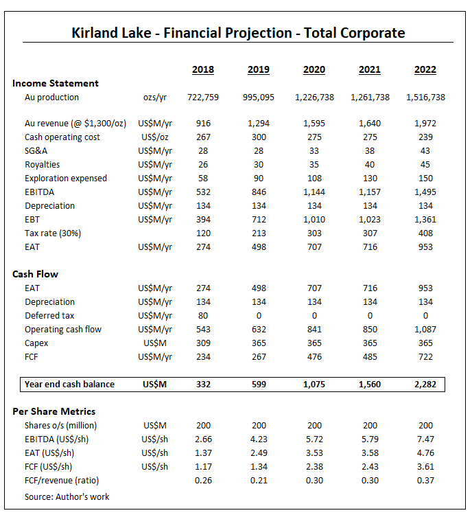 Laut dieser Prognose wird Kirkland Lake eindeutig auf einem relativ großen Kassenbestand sitzen, der in den nächsten vier Jahren weiter wachsen wird. Es wird interessant sein zu sehen, was Kirkland mit seiner wachsenden Cash-Bounty macht.