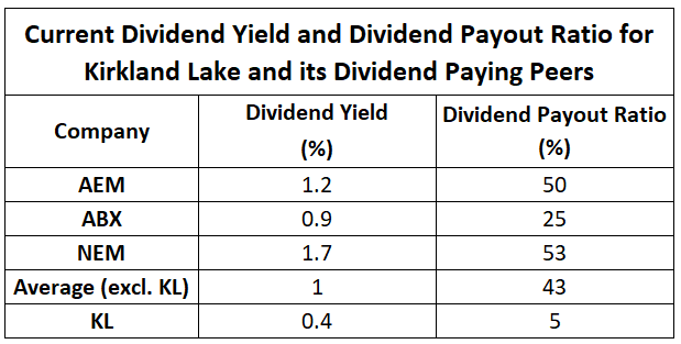 Sicherlich ist die häufigste Möglichkeit für ein Unternehmen, seinen Erfolg mit seinen Aktionären zu teilen, die Dividendenzahlung. Kirkland Lake leitete Ende 2017 die erste Dividendenzahlung ein und hat sie seitdem zweimal erhöht - was zu einer aktuellen Dividendenrendite von 0,4% führt, was weniger als der Hälfte der durchschnittlichen aktuellen Dividendenrendite von 1,0% entspricht, wie in Tabelle 3 unten dargestellt.