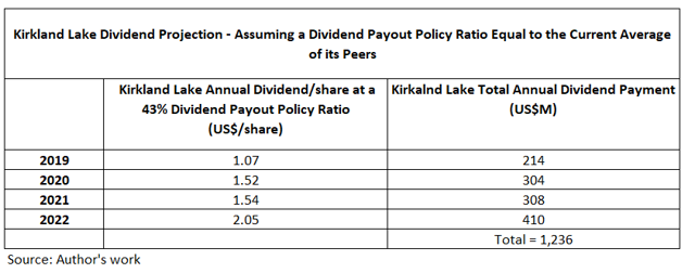 Als Beispiel für die Erhöhung der Dividendenausschüttungspolitik zeigt Tabelle 4 die prognostizierte jährliche Dividende pro Aktie von Kirkland Lake Lake und die gesamte jährliche Dividendenausschüttung unter der Annahme einer Dividendenpolitik von 43%, die dem aktuellen Durchschnitt der Vergleichsunternehmen entspricht. Die Annahme dieser Dividendenausschüttungsquote würde zu einer kumulativen Gesamtdividende von 1,236 Milliarden US-Dollar über den Zeitraum von vier Jahren führen. (Beachten Sie, dass die aktuelle Dividende von Kirkland Lake von 0,12 USD/Aktie jährlich einer jährlichen Dividendenzahlung von 24 Millionen USD/Jahr entspricht.)
