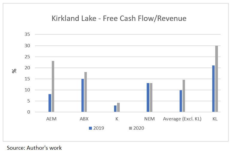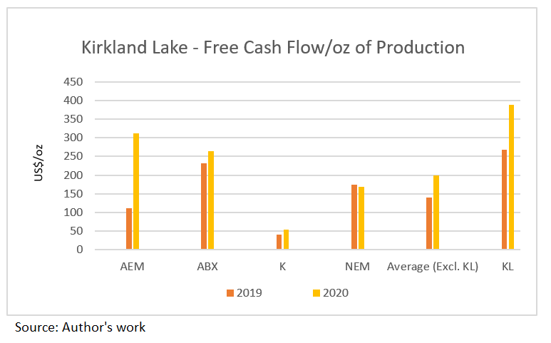 Diese beiden Kennzahlen sind umso beeindruckender, wenn man bedenkt, dass die Peers von Kirkland Lake in Bezug auf die Produktion etwa 2x - 5x größer sind - und daher normalerweise erwartet werden, dass sie dem Kirkland Lake in Bezug auf die FCF-Erzeugung überlegen sind.
