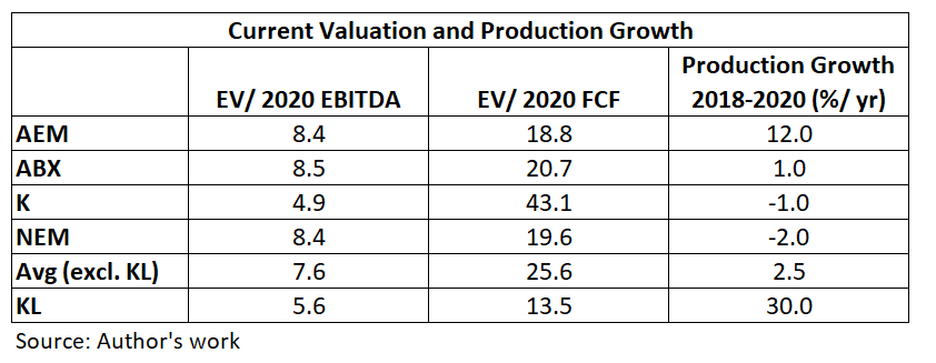 Darüber hinaus ist die Bewertung von Kirkland Lake noch extremer, wenn man diese beiden Bewertungskennzahlen mit der durchschnittlichen jährlichen Wachstumsrate der Produktion für jedes dieser Unternehmen in den nächsten zwei Jahren vergleicht (siehe rechte Spalte in Tabelle 5).
