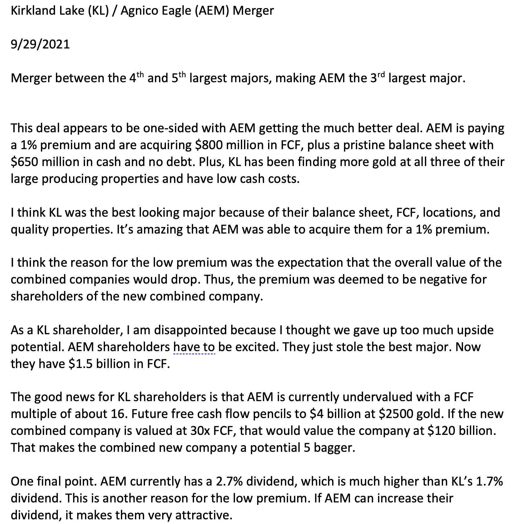 Ich für meinen Teil werde gegen die geplante Fusion zum aktuellen Preis stimmen. Ich habe sehr wenig Interesse daran, dass meine unterbewerteten Kirkland Lake-Aktien durch viel höher bewertete Agnico Eagle-Aktien verwässert werden, mit dem Versprechen von Synergien in den nächsten Jahren. Denken Sie daran, dass nur 46 % der geschätzten Synergien vor Steuern von 0,8 Mrd. USD in den nächsten 5 Jahren den Aktionären von Kirkland Lake zugutekommen werden. Die Bewertungsdifferenz ist aus meiner Sicht weitaus größer.