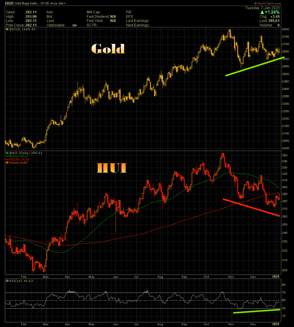 Die (bekannte) Underperformance der Minen ist vollkommen irrational. Ich poste mal paar Pics von Gold und HUI. Weniger als 'normale' Chartanalyse, sondern einfach um die Widersprüchlichkeit zu visualisieren. Widerspruch der sich markt-technisch nicht erklären lässt. Da ist die 'Hand Gottes' im Spiel ...