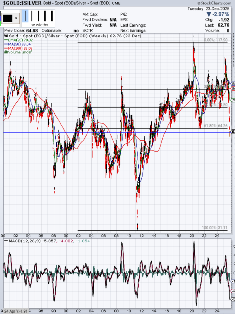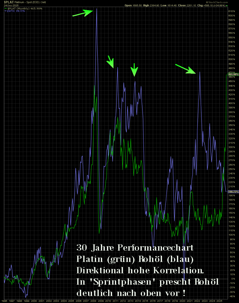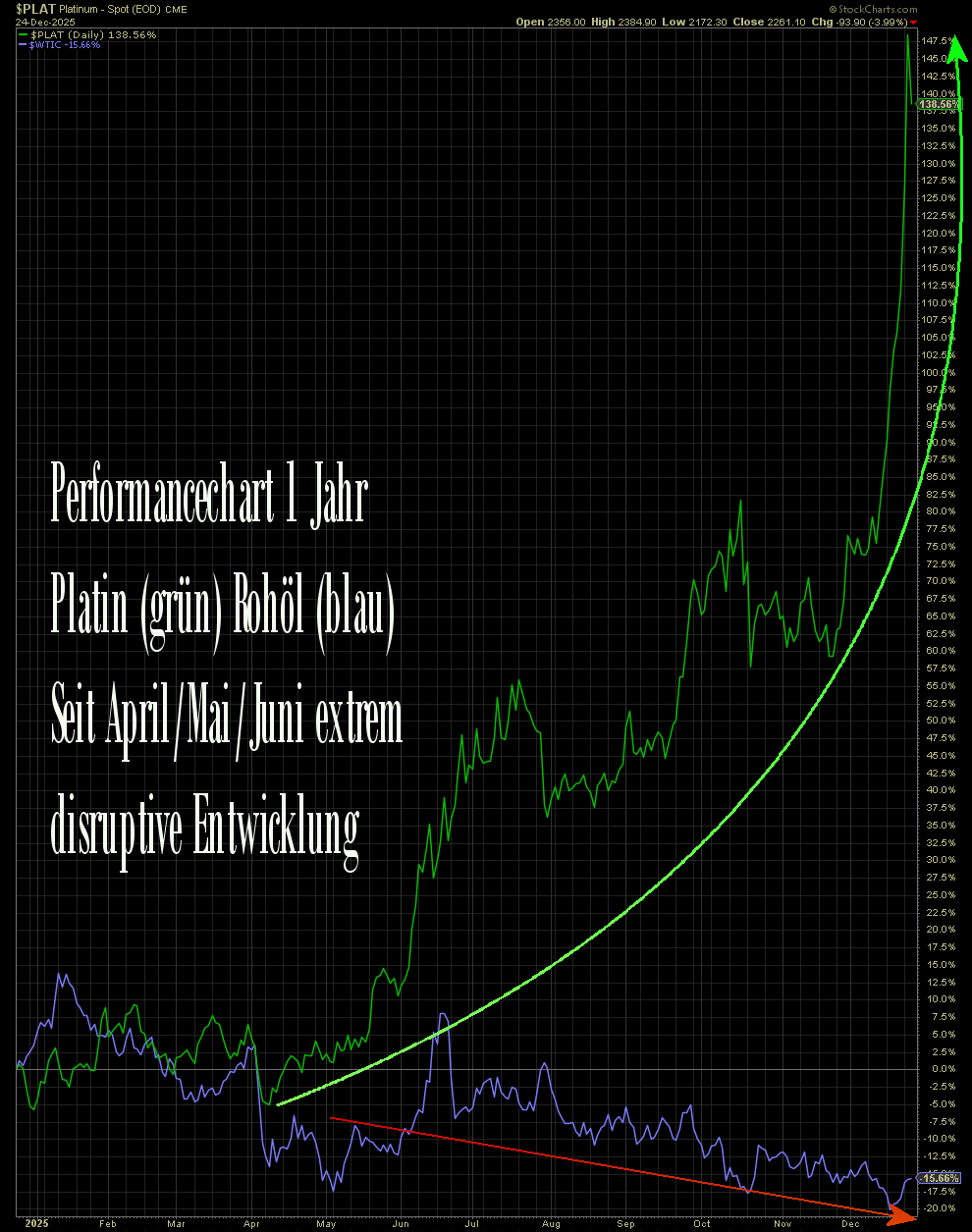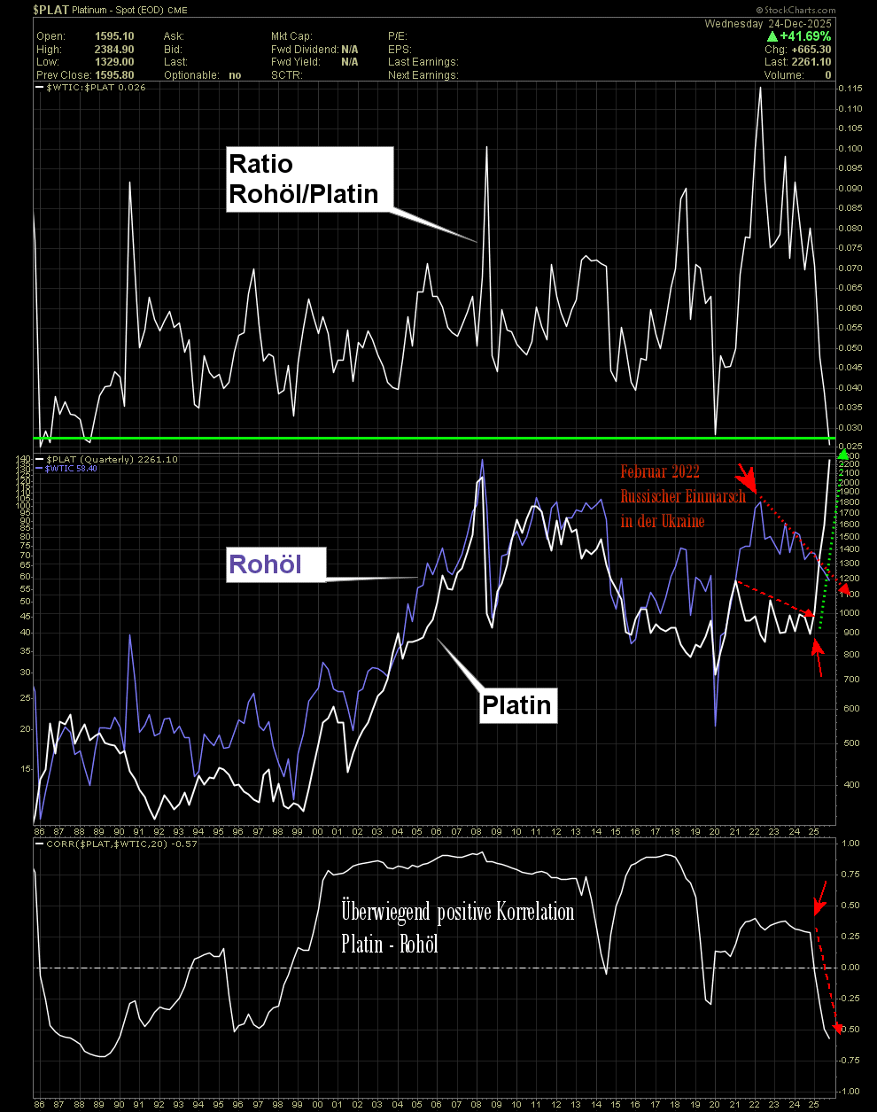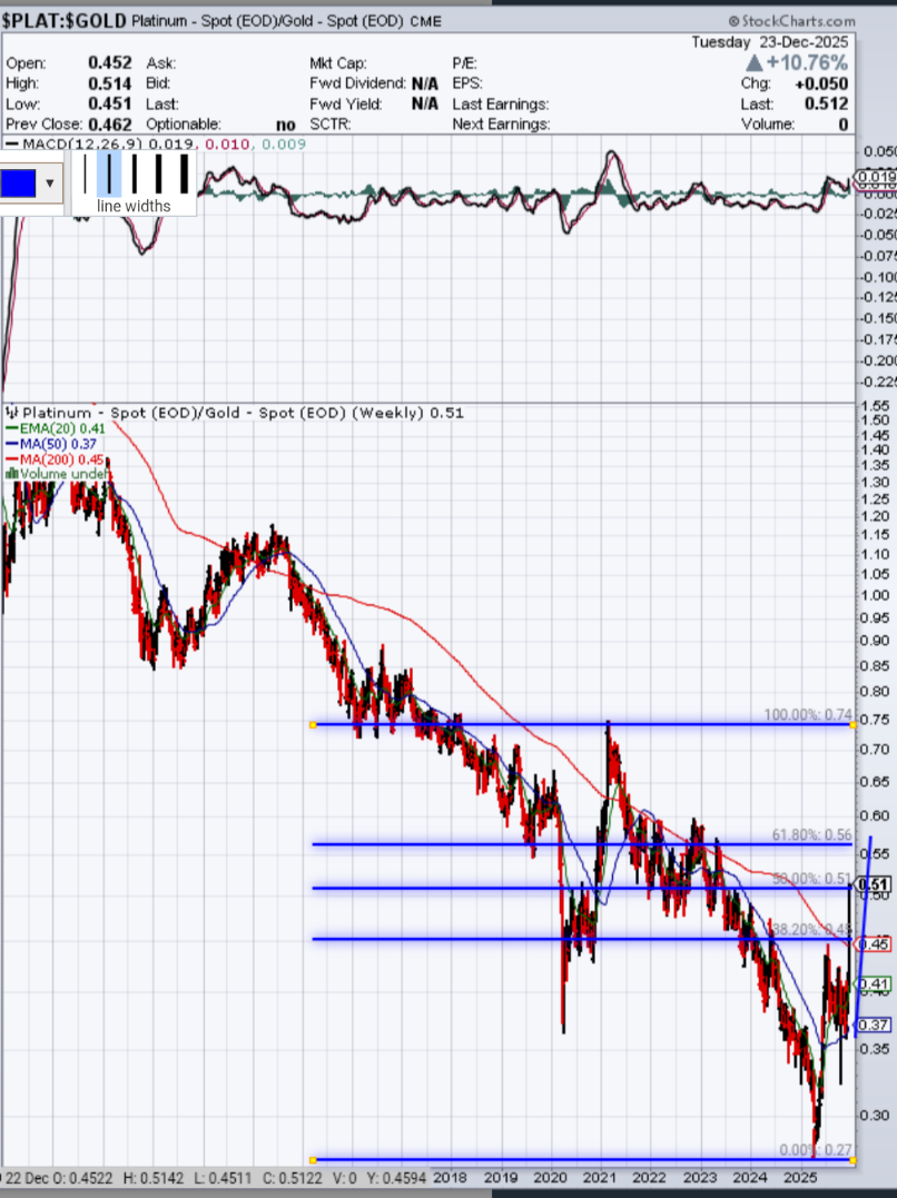 2. Platin zeigt gegen Gold einen neuen, ansteigenden Trend auf Wochen- und Monatsbasis, dh höhere Hochs und höhere Tiefs. Auch das Hoch des Vorjahres 2024 scheint nun dynamisch vom Jahresschlusskurs übertroffen zu werden, das sieht nach Reversal auf Jahresbasis aus, eine tolle Jahreskerze 2025. Die übergeordneten Ziele sind noch in weiter Ferne.