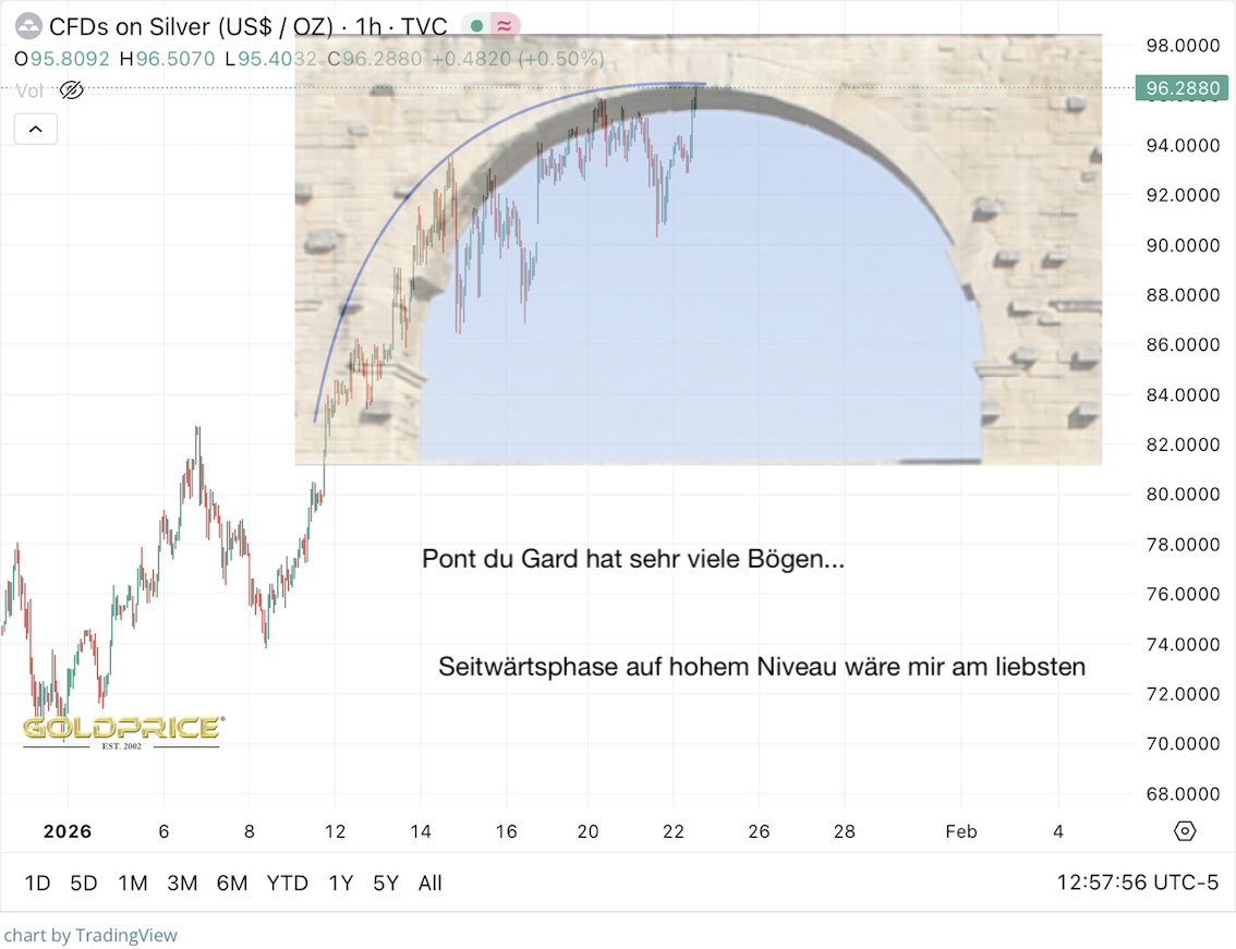 Werner, bei welchem Preis würde Silber 2026 bzw. 2027 an der mittleren Aufwärtstrendline andocken?