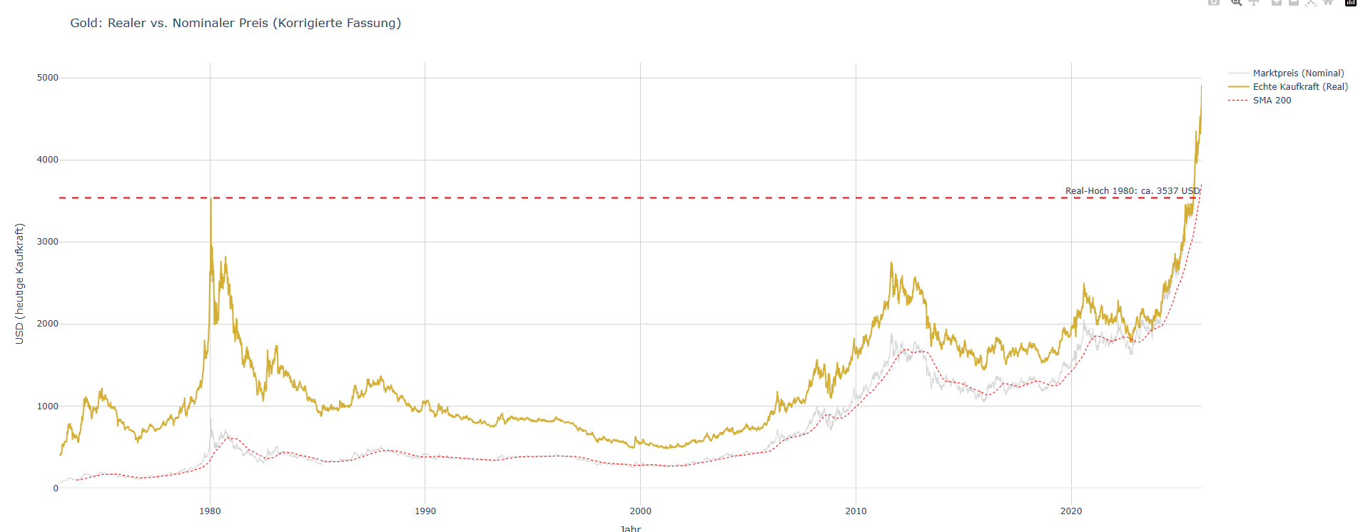Ich konnte heute Nacht nicht schlafen. Und da ich gestern gelesen habe, dass der Abstand von Silber aktuell größer als 100% vom GD 200 sein soll habe ich mal in meinen historischen Daten gewühlt und einen Chart erstellt. Also in 1980 waren wir bei 250%. Wäre also noch bisschen Potential. Allerdings zeigt der Chart auch eindeutig, dass es irgendwann auch ordentlich einen auf´s Dach gibt.....