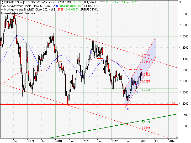 Wenn die Preiskurve in der Vergangenheit 3 mal an einer schrägen Linie die Richtung gewechselt hat, dann ist es meines Erachtens nicht unintelligent bei der 4. Annäherung wieder mit einem solchen Ereignis zu rechnen. Kein MUST ! Aber eine Möglichkeit, eine erhöhte Trendwechselwahrscheinlichkeit ! So auch geschehen: