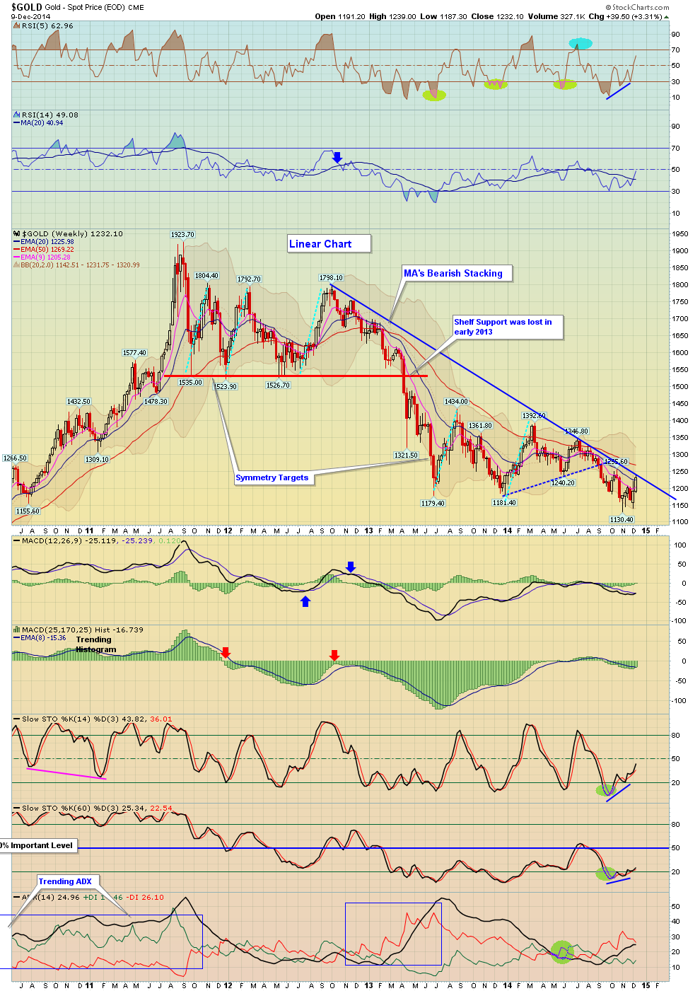 Rein zufällig gibt es dort eine Kreuzunterstützung aus Aufwärtstrend und dem Hoch der letzten Goldhausse (1979/80)