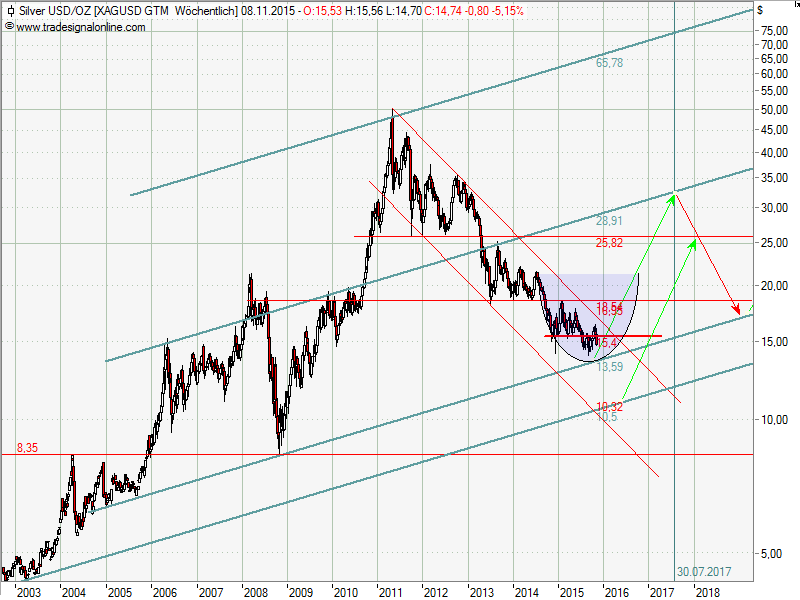 Ich habe mal den GS-ratio reingestellt, den keiner besser kennt wie woernie. Er hat wirklich sehr viel Aussagekraft. Wir sind noch immer im Kanal und der Pfeil zeigt die Richtung. Sollte Silber auf 13,50$ fallen, rechne ich mit einem ratio von erneut 80. Sollte Silber tatsächlich auf 10$ fallen, sehe ich das ratio bei ca. 95-100 und damit wäre gold bei 950-1000$...trotzdem sollte 2015 und 2016 die lange und standhafte Bodenbildung sein...