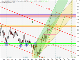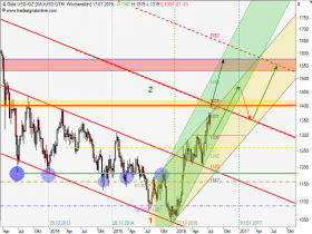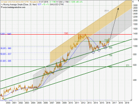 Ich habe nochmal den chart reingestellt, den ich vor kurzem reingestellt habe,weil es spannend ist. Was kommt jetzt?? Heiss gelaufen?? Im gelben kanal haben wir das obere Ende erreicht und jetzt müssten wir seitwärts bis 2017 laufen um ein höheres Tief zu machen und den Kanal so zu bestätigen...Dann hätten wir dann nächstes Jahr wahrscheinlich die 1550..