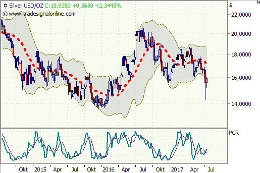 Ich denke, dass heute mit 15,19 $ der Wendepunkt gesetzt worden sein könnte. Es ging am Freitag von 16,01 $ auf 15,37 $ (Welle a und 38,2 % Retracement der Aufwärtsbewegung 14,36 $ bis 16,01 $), dann hoch bis 15,64 $ (Welle b) und heute runter auf 15,19 $. (Welle c und 50 % Retracement der Aufwärtsbewegung 14,36 $ bis 16,01 $) Danach deutliche Reaktion nach oben. Eine mustergültige EW-Korrektur sieht genauso aus. Welle a zum 38,2 % Retracement und Welle c dann zum 50 % oder 61,8 % Retracement. Aufgrund der miserablen Stimmung, der guten Minenaktienperformance sowie der nun bereinigten COT-Daten (s.o.) besteht hier eine ganz gute Chance, die Wende nach oben heute gesehen zu haben. Ein nochmaliges Anlaufen von 15 $ oder knapp darunter wäre jedoch kein Beinbruch und würde mir sogar noch besser gefallen. Ich gehe aber eher davon aus, dass das nicht mehr passieren wird.