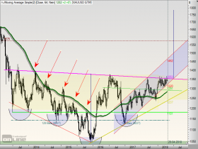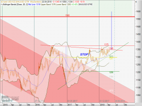 • In den letzten 3 Monaten fiel der Goldpreis 2 mal auf das untere Bollingerband, einmal um den 07.-09. Februar und ein weiteres mal um den 15.-20. März. Danach gab es jeweils einen Anstieg von ca. 40US-$. Jetzt sind wir wieder einmal unten. Wenn das Muster hält, geht es ab morgen wieder gen Norden. Zum Ausbruch aus der Trading-Range würde es aber (leider) wieder einmal nicht reichen.
