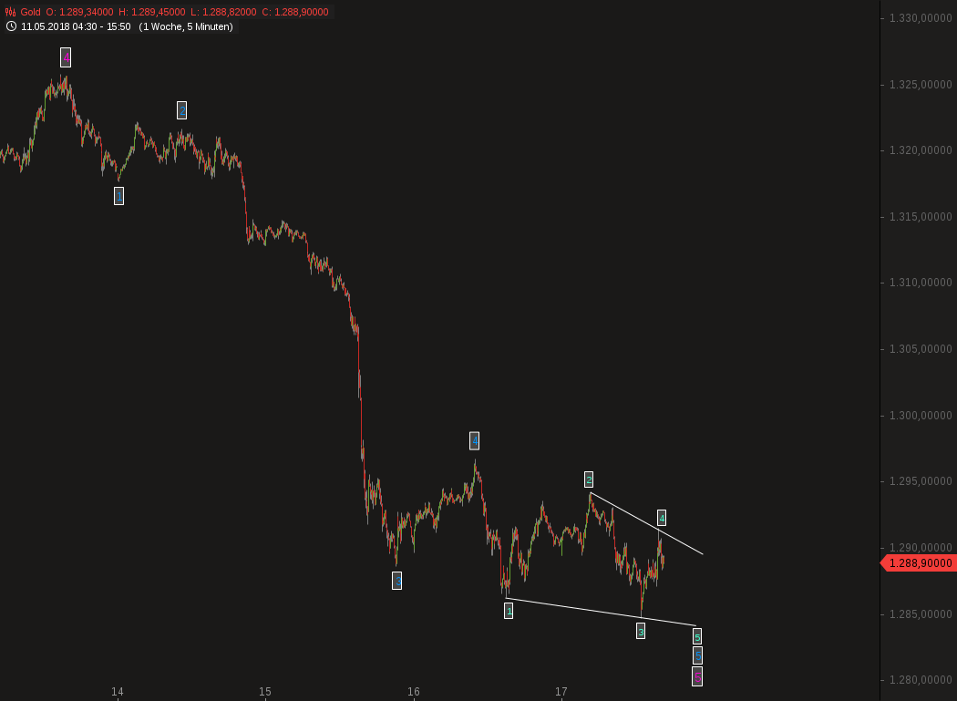 Die 1.293 $ wurden noch nicht überschritten und die kleine 4 war aber wohl noch nicht ganz fertig, sodass die 5, wenn sie denn noch kommen sollte, erst jetzt beginnt. Solange es also keinen Ausbruch über 1.293 $ geben sollte, müsste heute Nacht oder morgen früh das Ende der Korrektur bei 1.283,xx $ erfolgen.