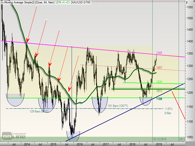 ... aber dafür hat der POG gestern mustergültig auf der unteren Begrenzung des kurzfristigen Aufwärtstrendkanals aufgesetzt. Im Tief wurden 1317 USD erreicht; damit wurde die obere Begrenzung des zweiten Pullback-Auffangbereichs touchiert. Seit heute morgen geht's wieder aufwärts (passend zum heutigen Karnevalsauftakt wahrscheinlich wegen des "Dreigestirns" Kim / Trump / Cohen):