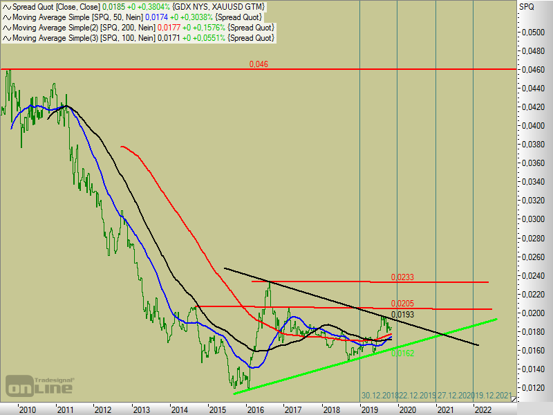 Hier GDX zu POG. Die MA steigen langsam und fangen an sich zu überschneiden, positiv. MACD ist noch niedrig aber im Verkauf. Positiv ist der aufsteigende Trend, der umbedingt halten muss. Wenn wir das 2010-2011 erreichen wollen, schaffen wir das wohl erst in paar Jahren. Dazu benötigen wir einen steigenden POG und ein Verhältnis von 1:3 oder 1:4