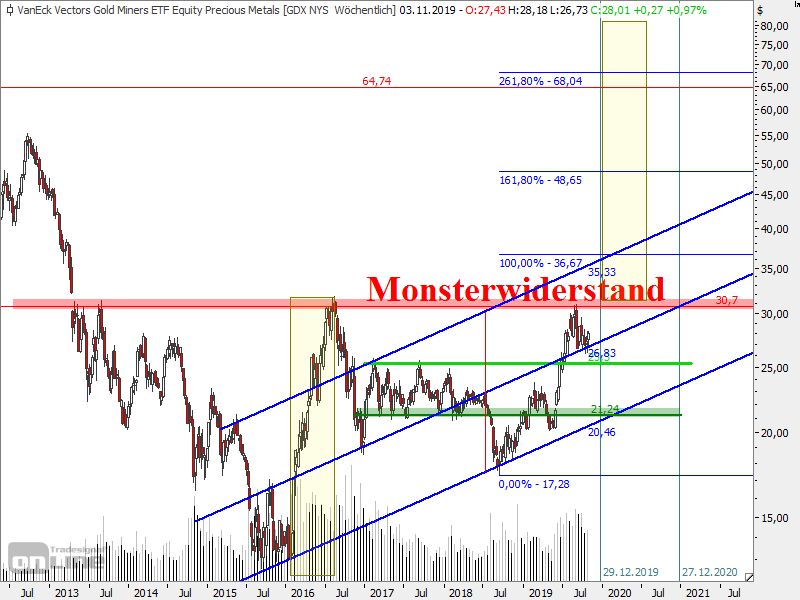 Wichtig ist die mittlere Trendlinie 26,88 nicht zu durchbrechen. Dann in 2020 das 2016er Hoch durchbrechen und dann sollten wir den oberen Trendkanal verlassen und dann sollte es richtig dynamisch werden mit Ziel ca.65-80...danach eine längere Korrektur mit Ziel zwischen 45-32...Monsterwiderstand zu Monsterunterstützung!!