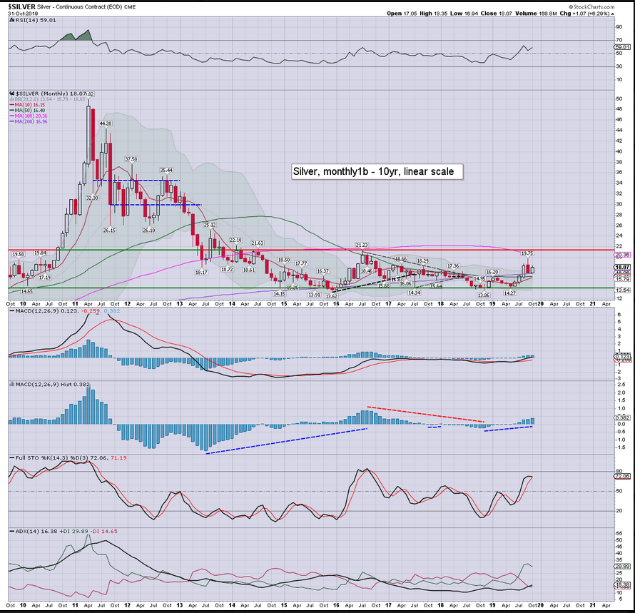 Silber: Ein starker monatlicher Nettogewinn, mit mehrmonatiger Preisstruktur einer Bullenflagge. Großes Ziel ist die Schlüsselpreisschwelle von 21 $, mit dem Höchststand von 21,23 $ 2016. Eventuelle Preisaktionen >22s werden weitaus größere Auswirkungen haben.