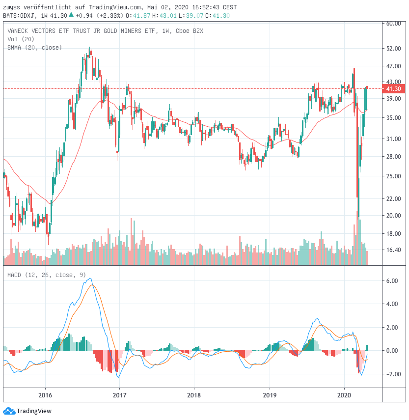 GDXJ : fällt dagegen deutlich ab. Noch schlechter die Performance der Silberminen.
