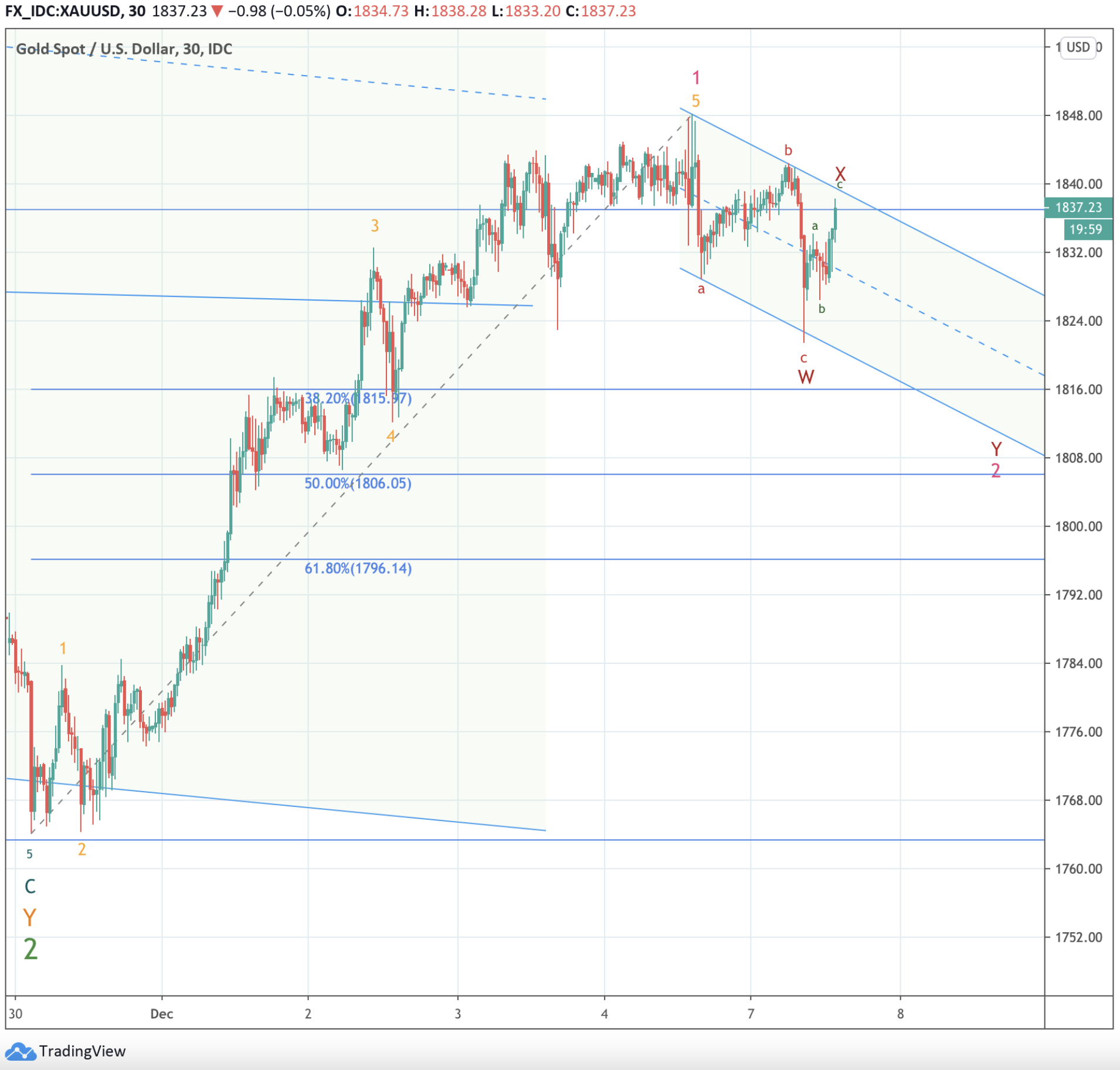 Geht es nicht unter 1.821,x $ war das mit hoher Wahrscheinlichkeit erst eine 4 und es würde noch ein Anstieg bis ca. 1.850 - 1.865 $ folgen bevor es dann vermutlich ebenfalls in Richtung 1.810 $ gehen sollte.