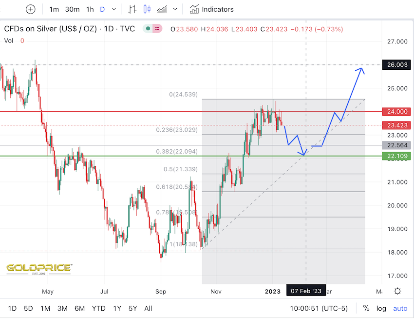 Gestern bin ich bei 24,30 in die Absicherung gegangen, nachdem Silber an der Abwärtstrendlinie gescheitert ist. Der 200-Tagesschnitt liegt irgendwo 21, es wäre schön, wenn Silber hier einen Henkel ausbilden würde.