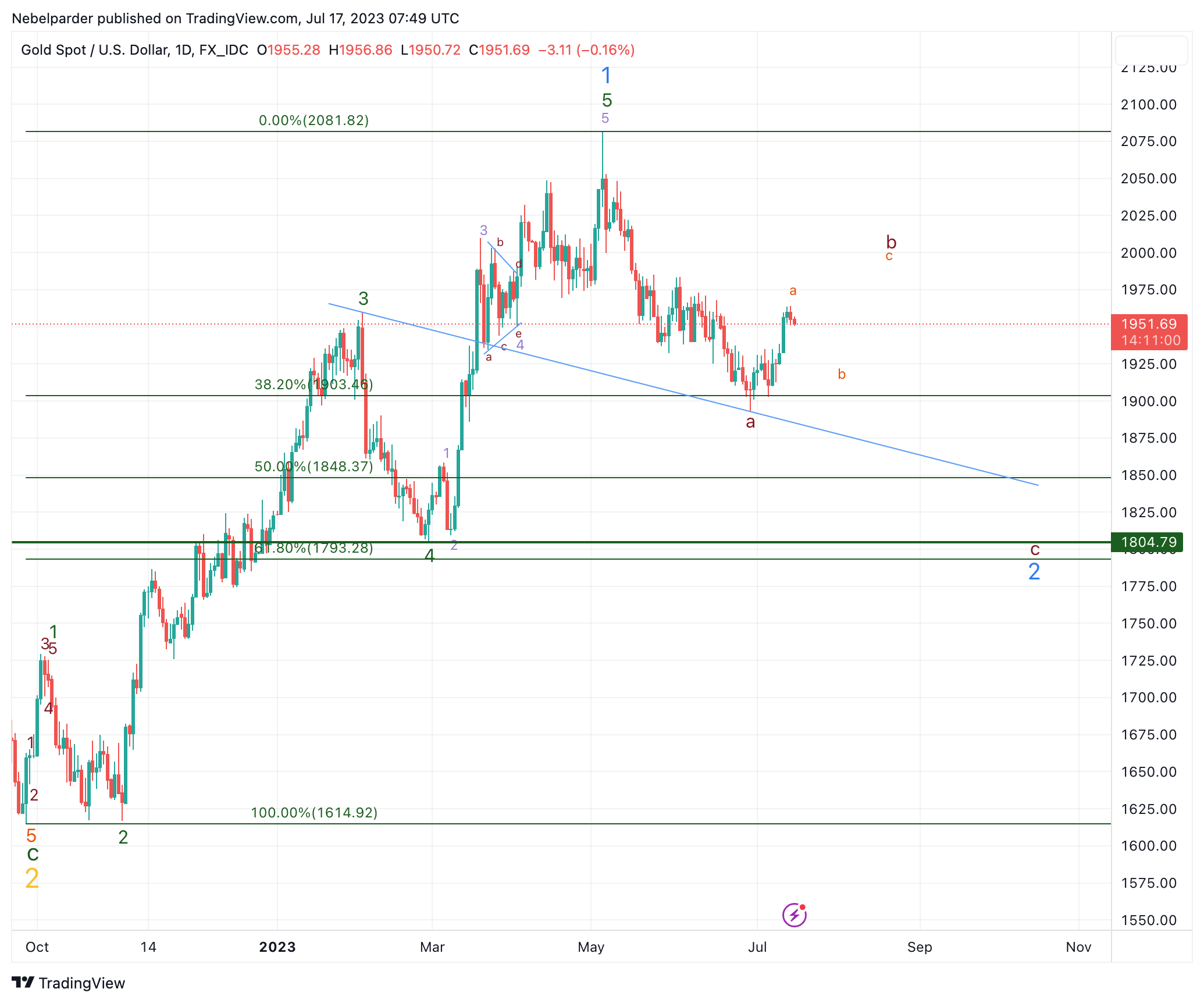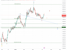 Da es deutlich höher ging, bis 1.987 $, könnte, aber das ist erstmal nur eine wage Vermutung, die Welle B ein Dreieck werden, bei der die 1.987 $ den höchsten Punkt darstellen würden.Ich hab es mal auf dem Chart skizziert, jedoch ist das erstmal nur eine Überlegung.