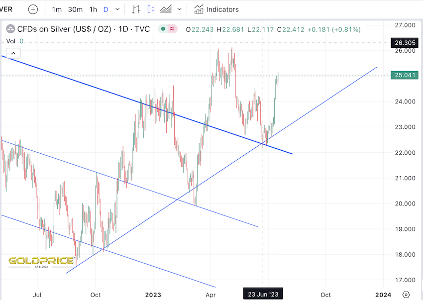 blaue Hilfslinien, soweit das Auge blicket...sorry, tut mir Leid, von mir relativ willkürlich eingezeichnet, nicht ganz den Regeln der Charttechnik folgend, eher um mich und meine Hoffnungen an SILBER zu sortieren.