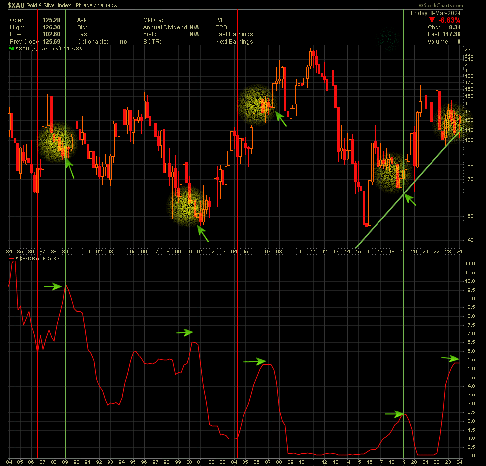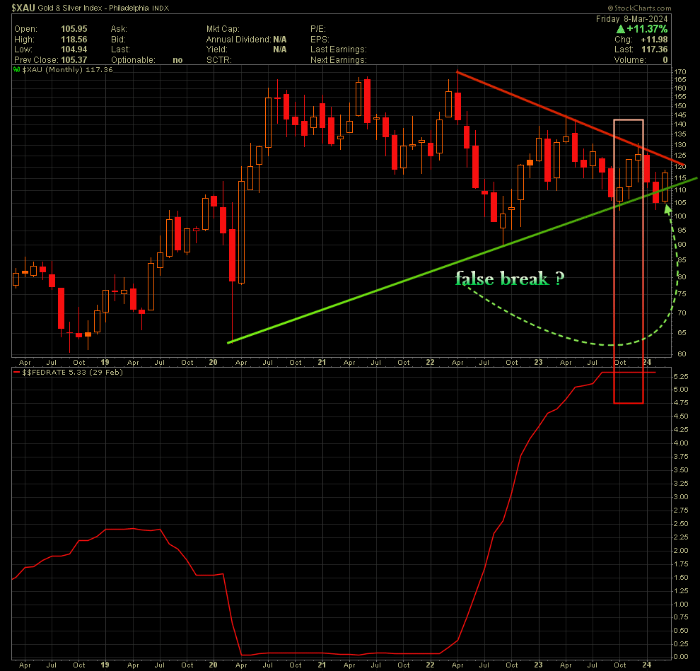 Unten in rot die FED Fund-Rate. Interessant: die (untypischen) 3 Monate mit steigendem Kurs in der Zins-Plateau (?) Phase.. Da haben die MInen schon etwas (verfrüht) voraus spekuliert auf fallende Zinsen. Liegt man jetzt richtig ?