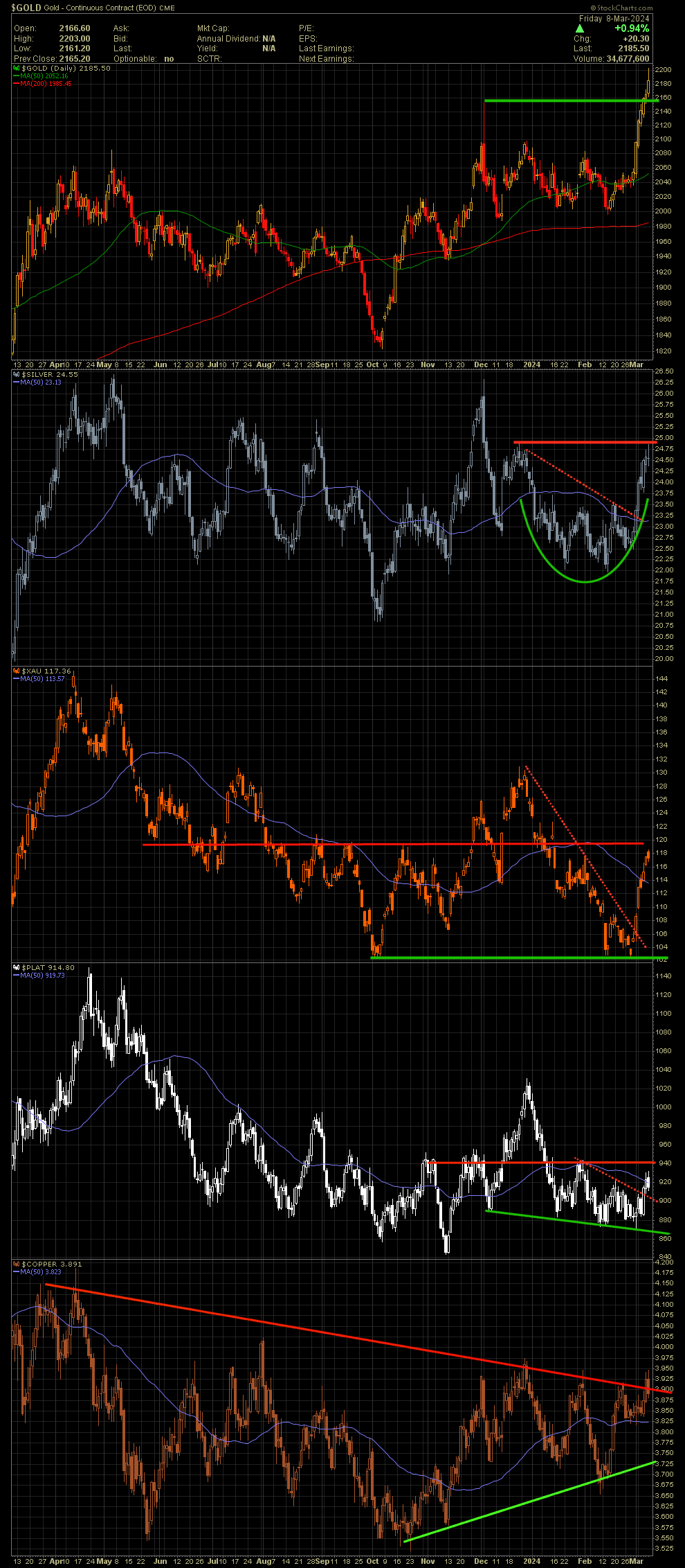 Alle unsere Companeiros haben zwar die kurzfristigen Abwärtstrends geknackt und schließen (bis auf Platin) wieder über den 50 Tage linien...aber während Gold jetzt auf Support thront , haben alle anderen saftige Widerstände vor der Brust. :hae:
