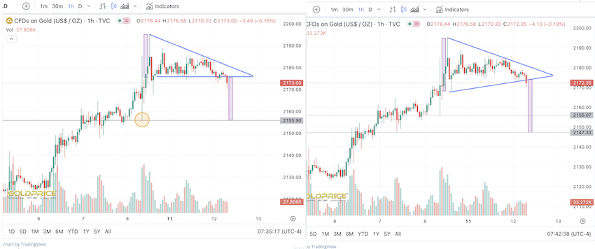 ...wenn der Gold-Kurs kurz vor dem Kreuzwiderstand zurück uns Dreieck käme, gleich die Oberseite durchbräche und in der Folge von oben den Kreuzwiderstand testen würde.