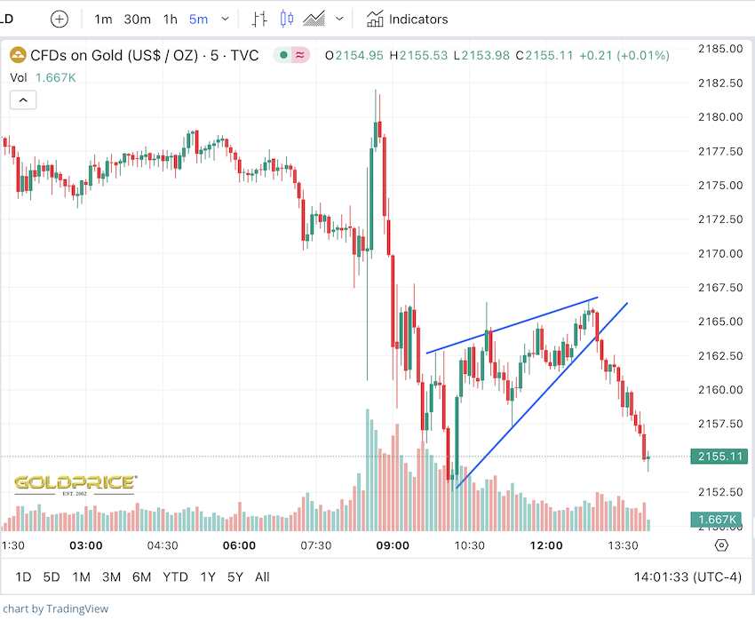 Ziel 1 bei 2.155 +- wurde bereits erreicht und auch unterboten. Im Zuge dessen bildete sich heute über drei Stunden hinweg ein Bärkeil, der im 5-Min-Chart gut erkennbar ist, einschließlich der entschiedenen Auflösung gen Süden: