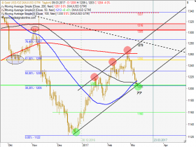 Bei 1.222 $ läge das 50 % Retracement des Anstieges von 1.180 - 1.264 $. Bei 1.223 $ hätte man zudem a=c in der grünen 2. Bislang sieht es so aus, als wäre die Wende nach oben in diesem Bereich geglückt. Allzu viel würde ich jedoch nicht darauf setzen. Die Gefahr einer ausgeprägteren Korrektur (bis ca. 1.180 $ +/-) ist durchaus als recht hoch einzuschätzen.