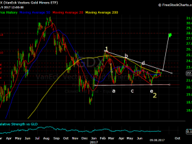 Da fehlt noch was. Minen haben im Vergleich zu Gold und Silber noch Nachholbedarf.... solange der GDX nicht über 23 bis 23.10 schliesst, ist mit weiterem Ungemach zu rechnen. Gelingt der Ausbruch, dann dürfte es richtig abgehen. Auch wenn es keine Welle 3, sondern nur eine korrektive c werden sollte, liegen 28 bis 30$ drin....... Dies würde natürlich zu wörnies Szenario mit dem Goldpreis in EUR passen.....