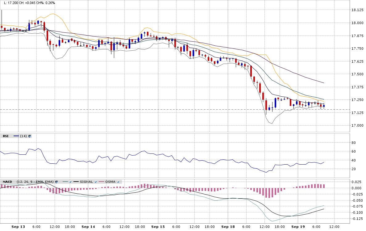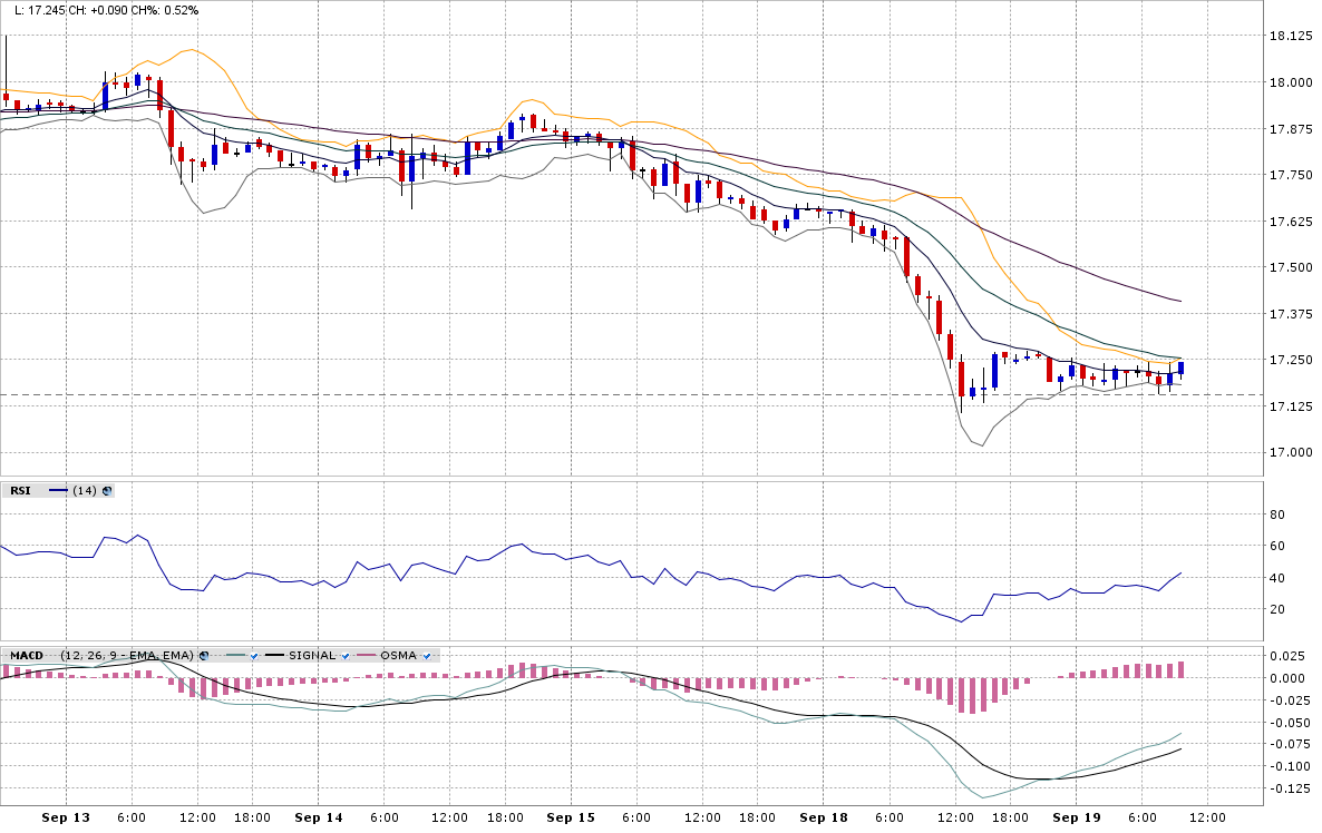 Besserung erst möglich, trotz doppelter Divergenz...., wenn, hier Silber Future 15 Minuten, die Symmetrie gebrochen wird. Seit dem Start gestern Abend ging Silber dem 9 MA entlang runter mit gelegentlichen Spikes zum 20 MA.