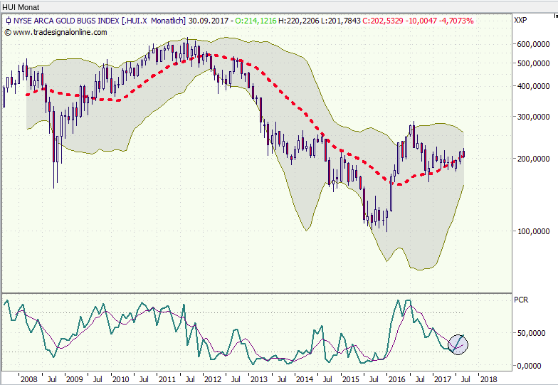 Drei Gaps beim HUI. Die Region um 200 ist eine wichtige Unterstützung (Mittleres Bollinger Band im Monatschart).