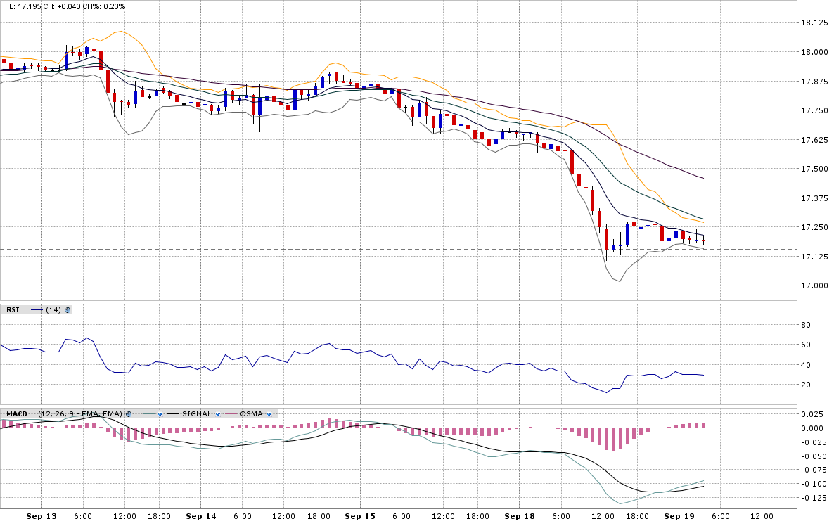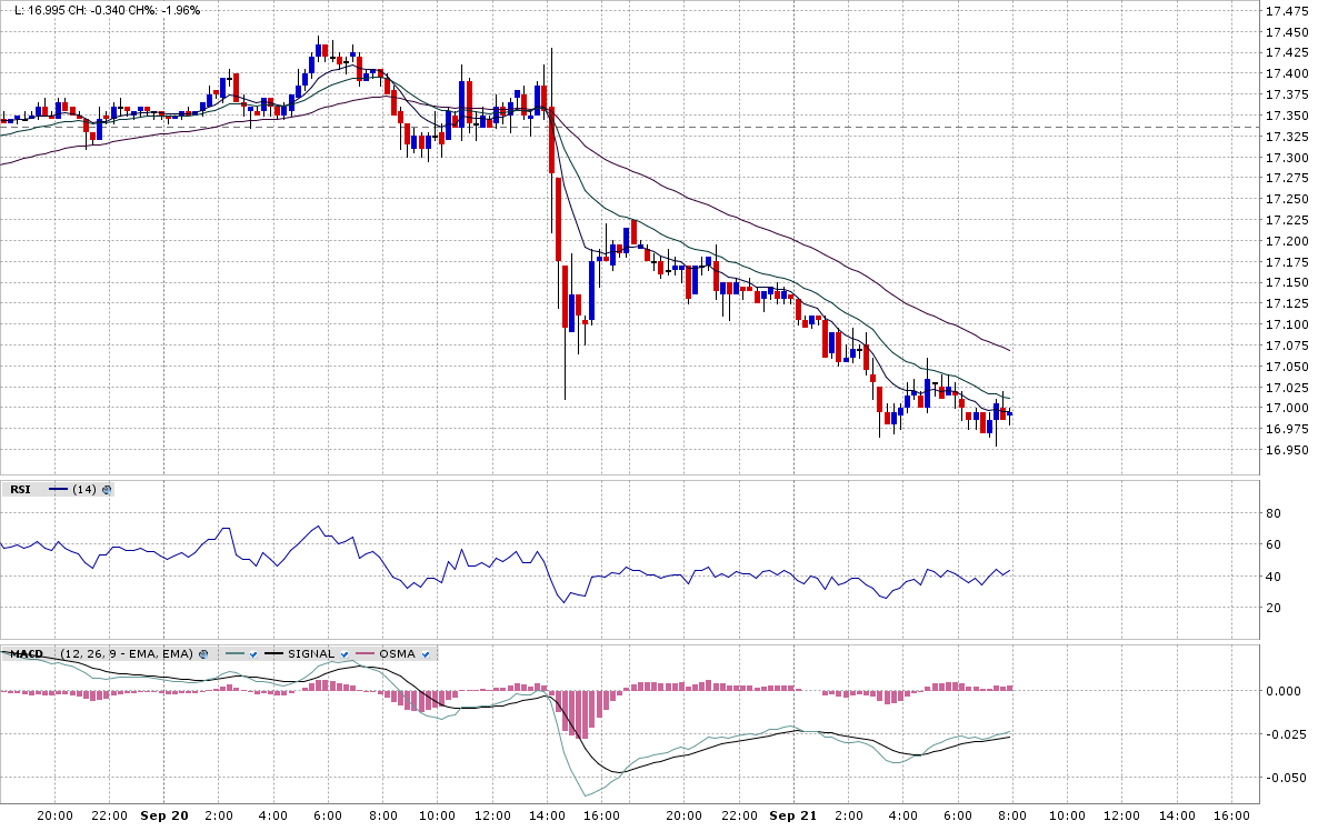 Besserung erst möglich, trotz doppelter Divergenz...., wenn, hier Silber Future 15 Minuten, die Symmetrie gebrochen wird. Seit dem Start gestern Abend ging Silber dem 9 MA entlang runter mit gelegentlichen Spikes zum 20 MA.